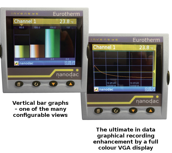 Full colour, 1/4 VGA, 320 x 240 pixel display. The Nanodac recorder has a variety of ways in which you can view your data - bar graph, trend, numeric values. The push-buttons below the display also enable scrolling between configured views.